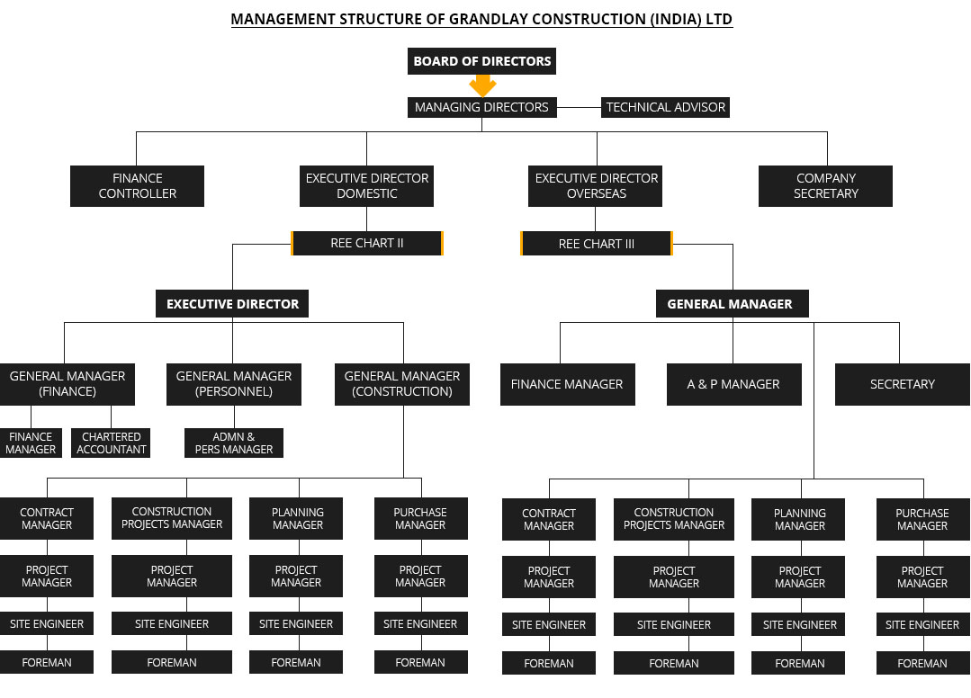 Grandlay Construction (India) Ltd. operates under a Board of Directors, supported by Managing Directors and a Technical Advisor. The organization is divided into key verticals led by the Finance Controller, Executive Director (Domestic), Executive Director (Overseas), and the Company Secretary.